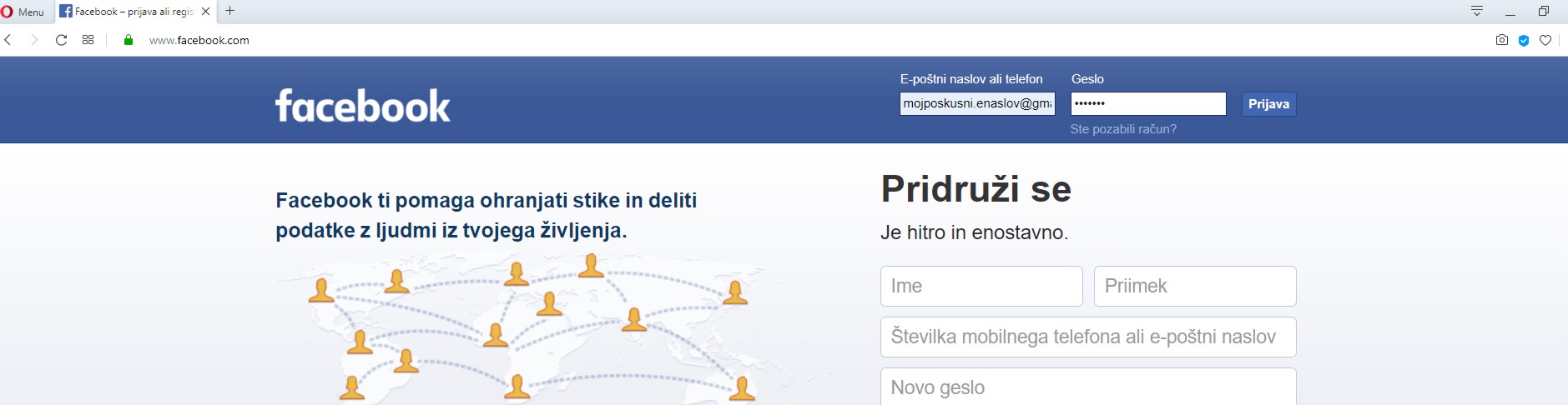 V orodno vsrtico najprej vpišemo www.FACEBOOK.com, potem sledi prijava: