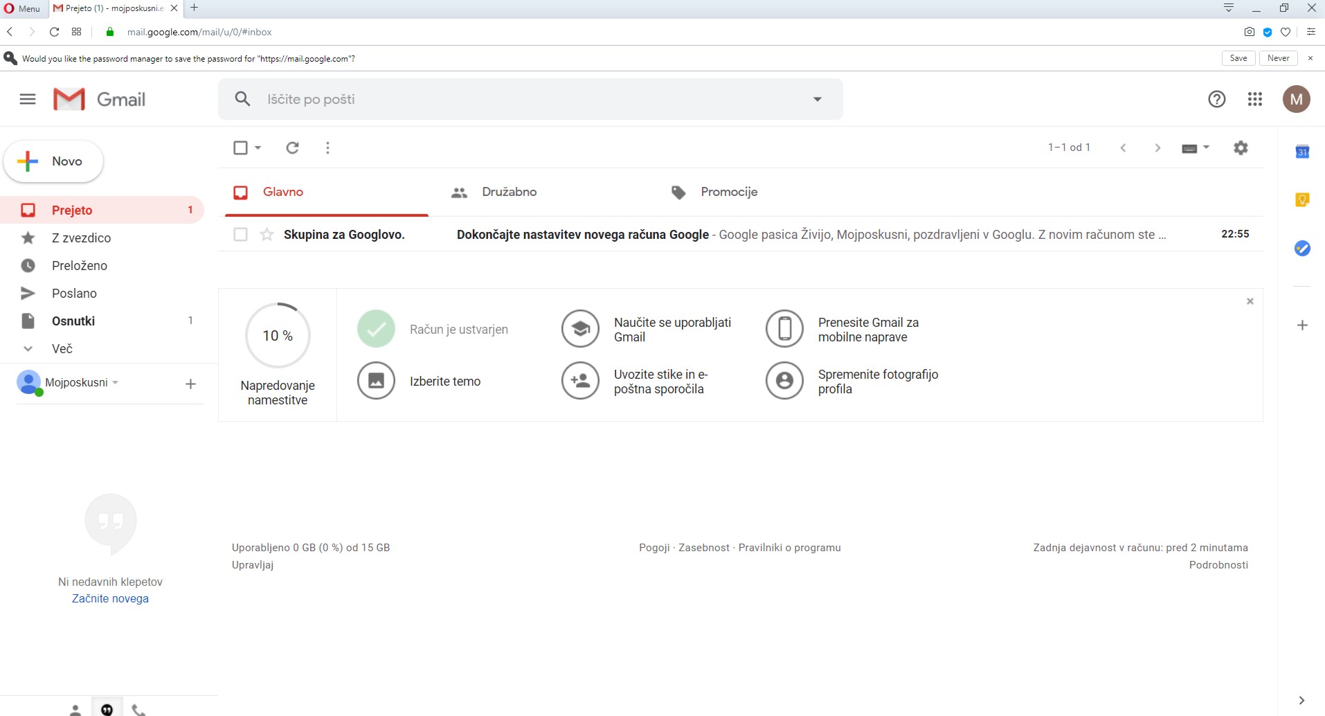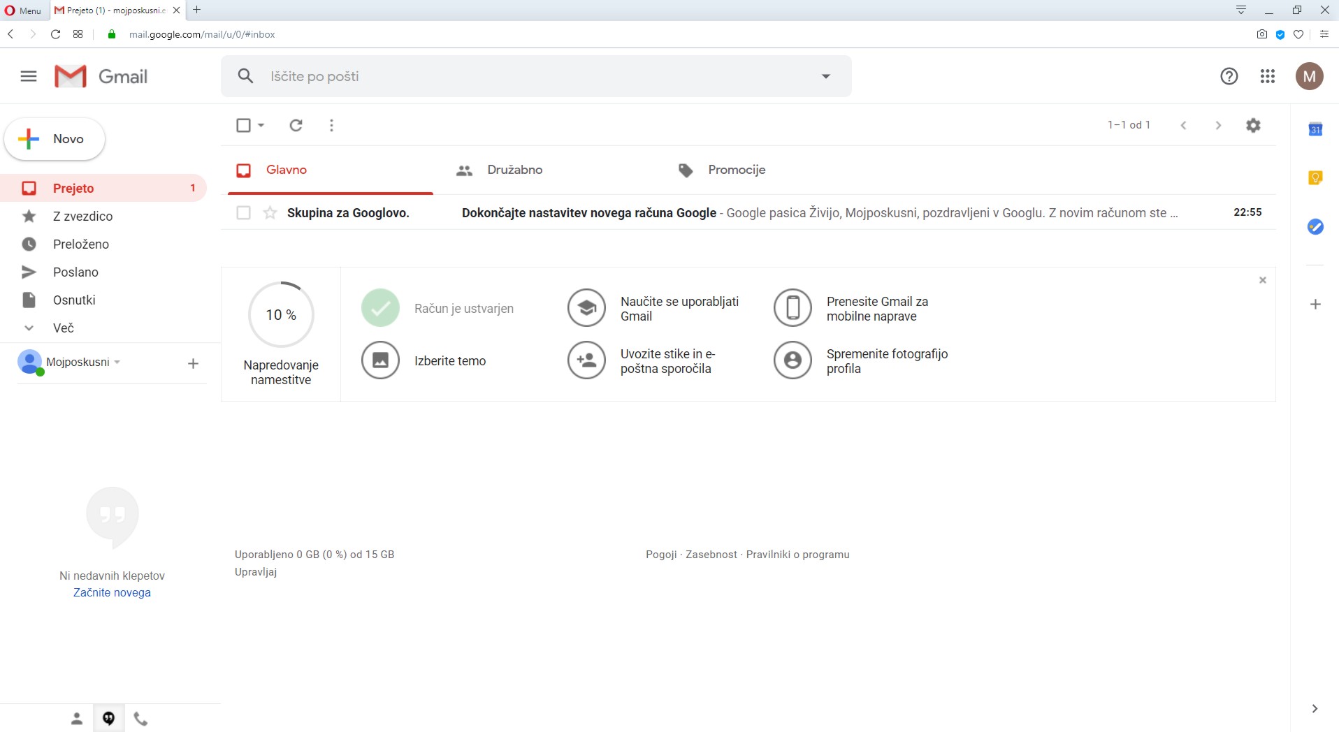 Prikaže se pozdravno okno v našem novem Google e-poštnem računu