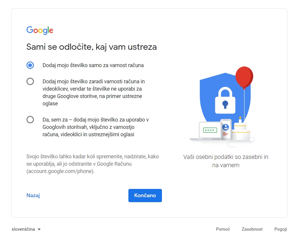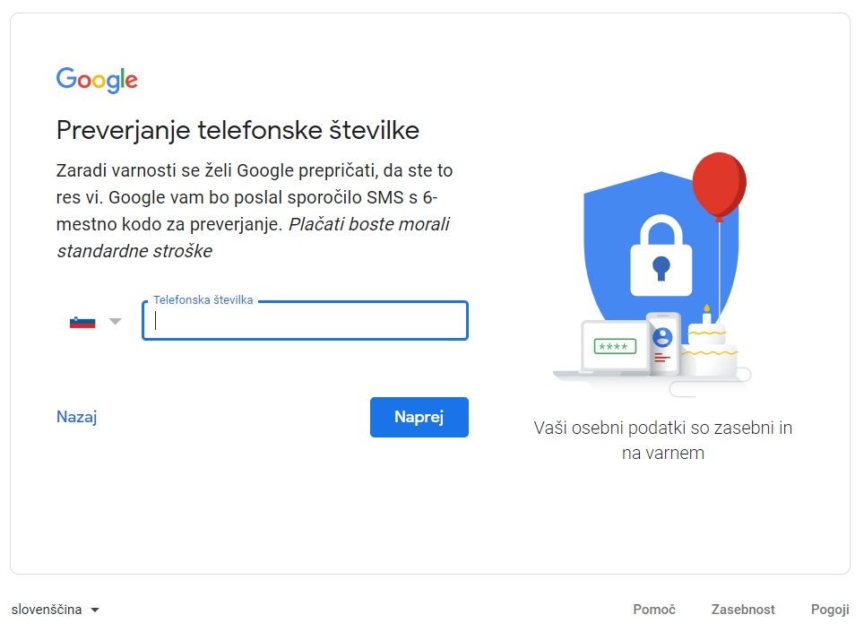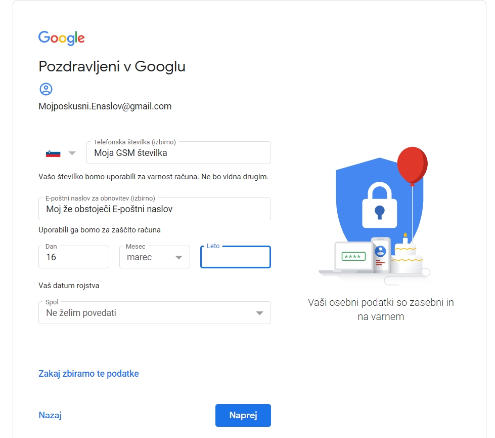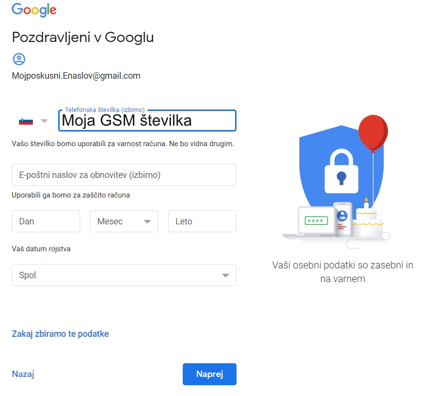 v Googlu - naš novi e-naslov je narejen, tako v okno Telefonska števila (izbirno) vpišemo našo mobilno številko