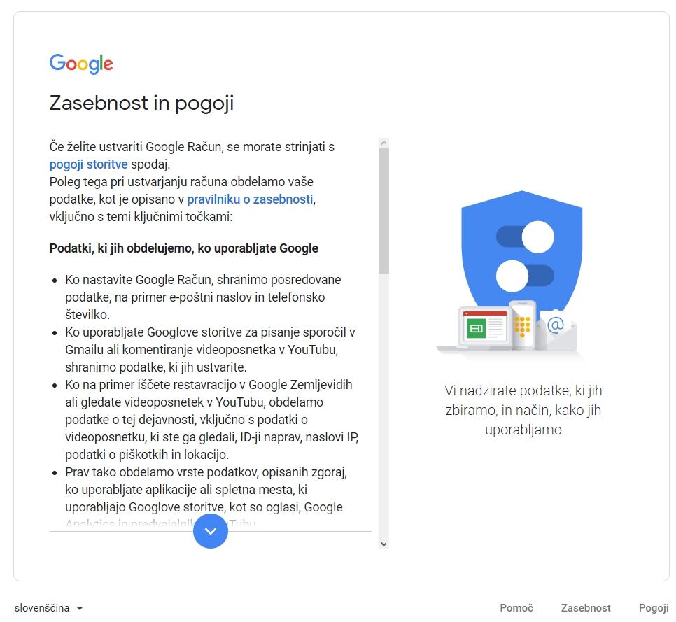 10. KORAK Odpre se okno - Zasebnost in pogoji,