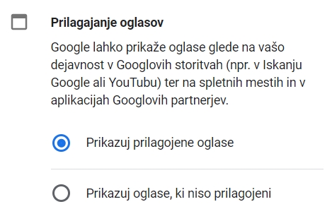 Nadaljujemo z drsnikom navzdol Izberemo - Prikazuj prilagojene oglase