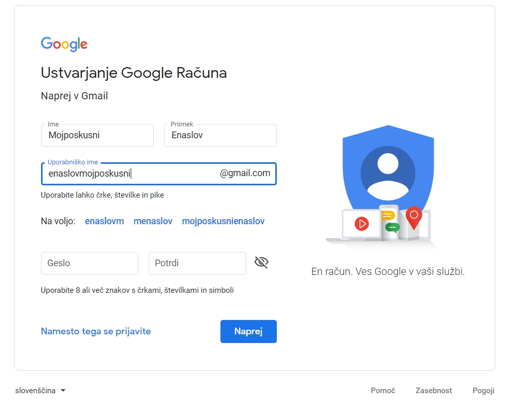 4. A v našem nazoren primeru bo IME: Mojposkusni in PRIIMEK: Enaslov