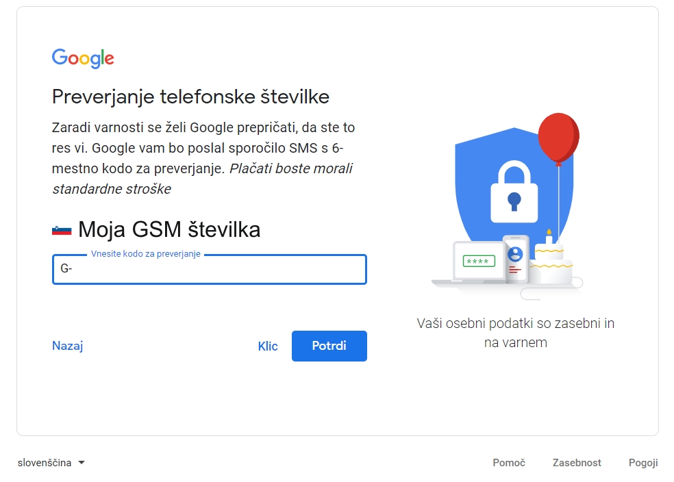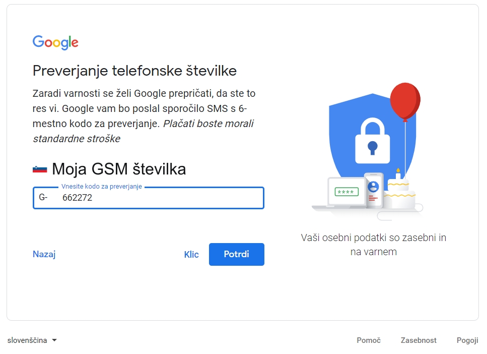 6. KORAK Na mobilni telefon prejmemo SMS sporočilo od Google, in sicer: G-662272 je vaša Googlova koda za preverjanje